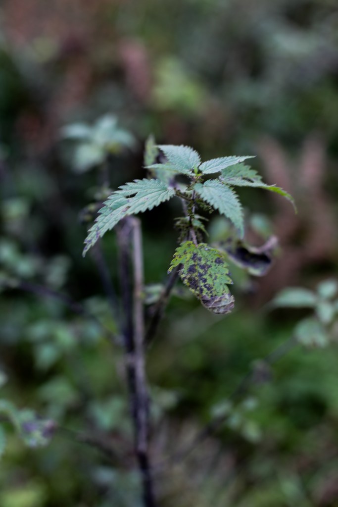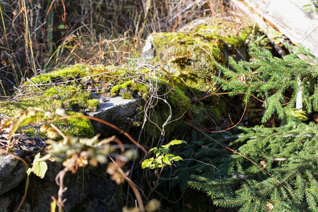 Det planterades skog där för några år sedan men de flesta granplantorna verkar ha kvävts av gräset. Om man fortsätter rakt fram så kommer man till den gamla ladan. Man kan tydligt se stenarna efter den och om jag inte missminner mig så har jag vid något tillfället sett trappstenar. Nu var det snårigt och svårt att se exakt vad stenarna varit till. Tittar man på kartan så stod ladan i öst-västlig riktning, vilket inte är riktigt vad jag kommer ihåg. Bakom ladan växte det mycket brännässlor, förmodligen där gödselstacken varit (dyngestan säger de här).