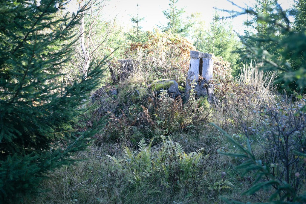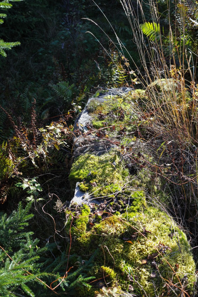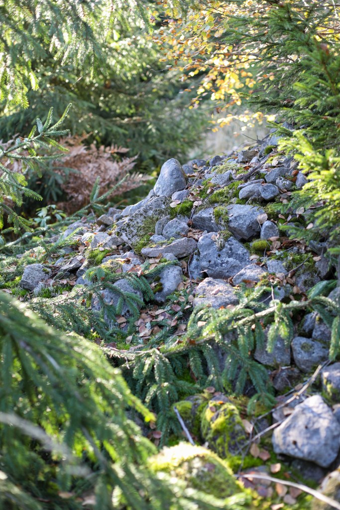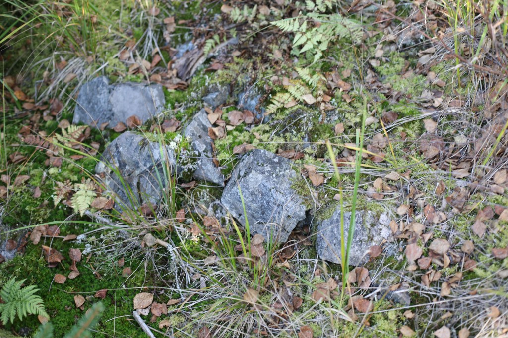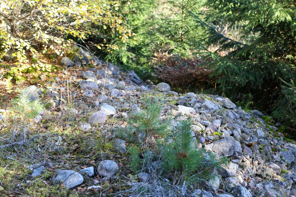 Längre norrut, där det är nästan som en liten kulle, var det ett annat röse och nästan som ett stenbrott. De kanske tog stenar till huset och ladan där. Framför ladan var också ett röse dolt av en stor gran.
