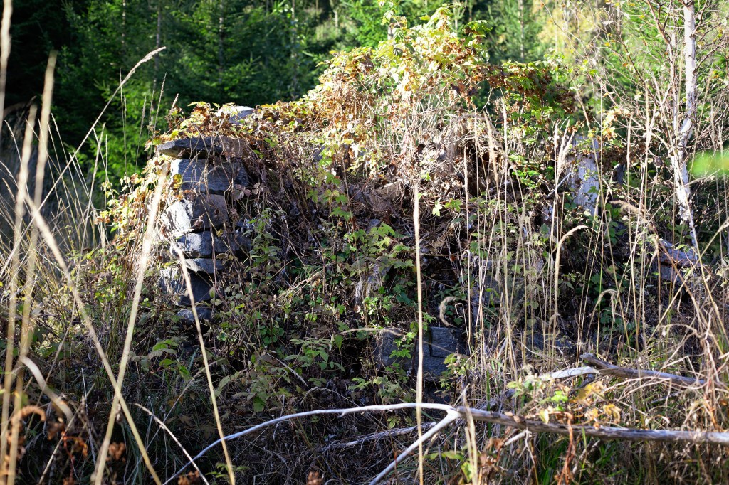 När jag vände blicken mot tjärnet till så såg jag murstocken och husgrunden. Första gången jag var här så var murstocken väldigt intakt och man kunde till och med ana skorstenen. Men sedan har det växt en stor gran i den så den har rasat.