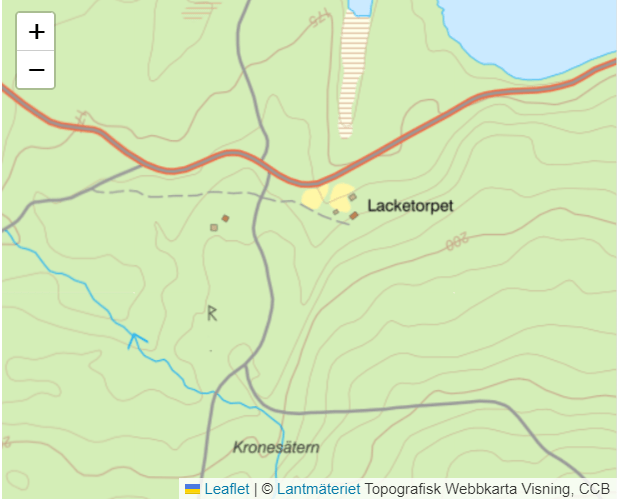 Gamla vägen som man ser ovan går mellan ladan och huset. Sätern som ligger söder om Lacketorpet heter Kronesätern och finns utmärkt på lantmäteriets kartor: