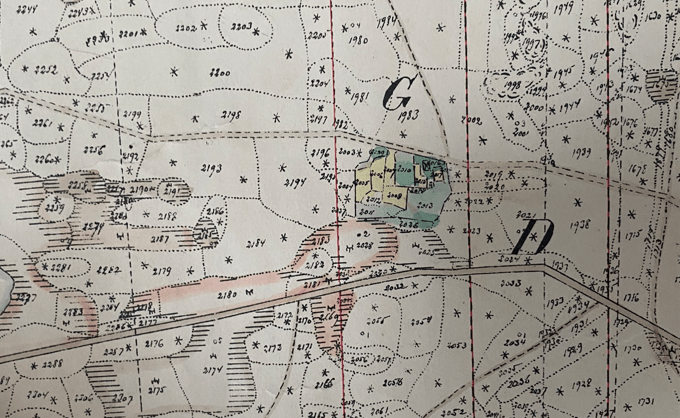 På kartan från 1820 ser man att gården låg på ett helt annat ställe, nere på myren: