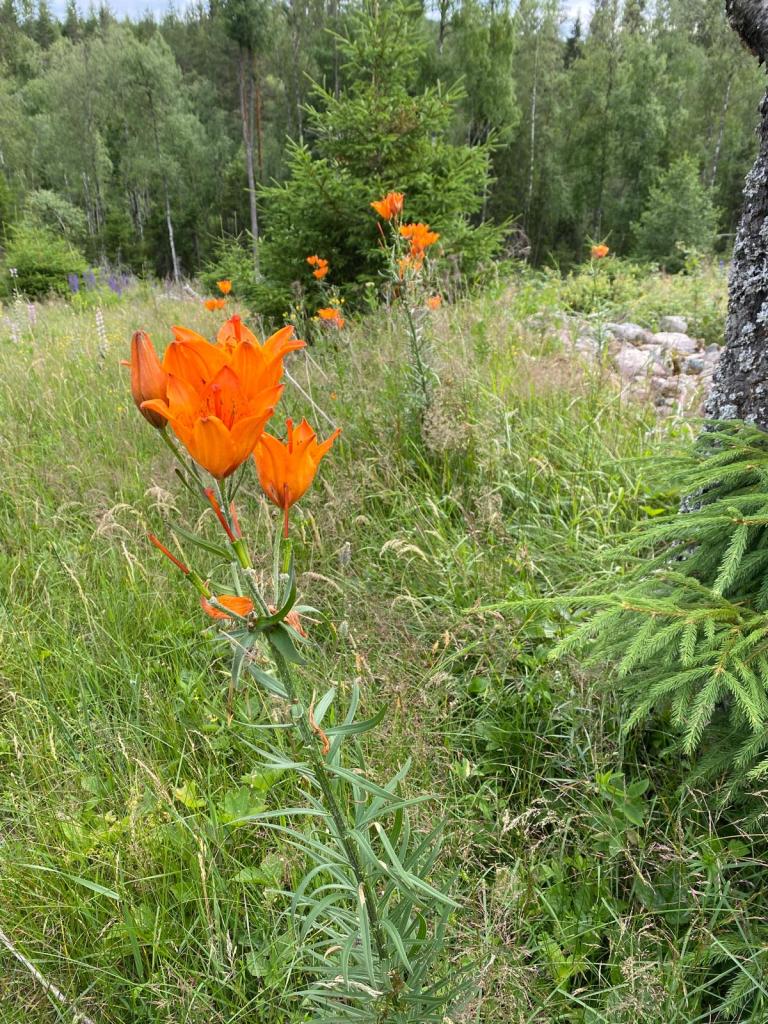 Det finns en gjuten trappa också, där man kan sitta och drömma sig tillbaka, bland lupiner och orangea liljor. Nattviol finns det också, vilket är mammas favorit på grund av doften. Jag har inte tänkt på det förut men det ser nästan ut som de har förbättrat en gammal husgrund genom att gjuta cement på den. Förmodligen har det legat ett hus här länge innan. Jag kommer ihåg att det under många år stod en syren vid huset uppe vid vägen, men jag tror att den är borta nu.