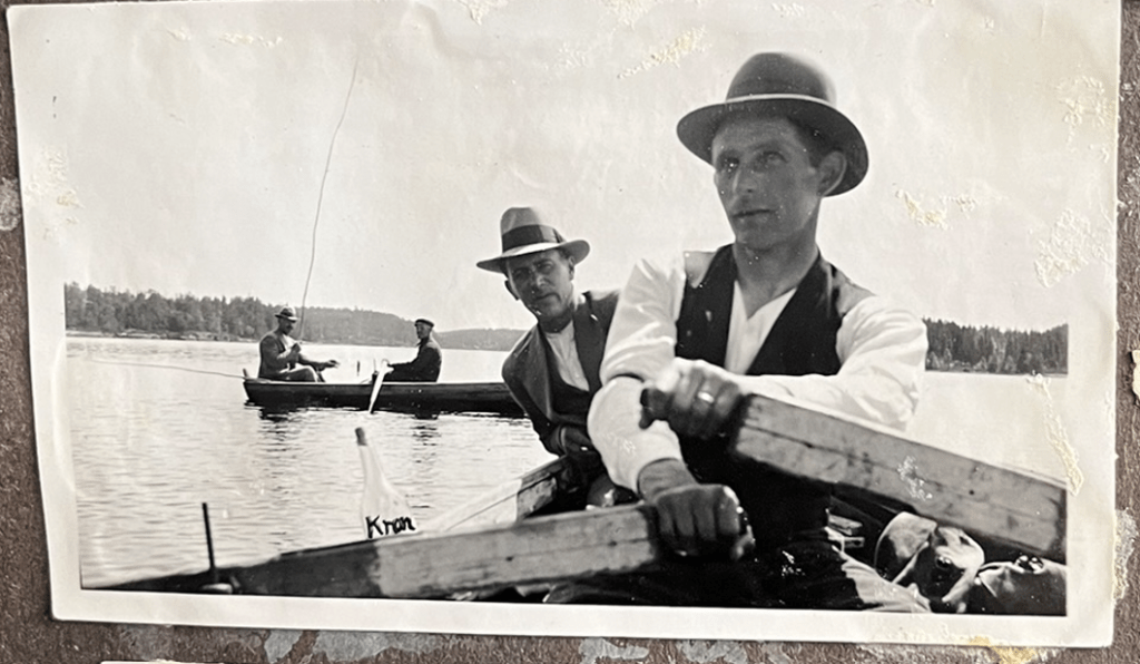 Det här tror vi är en fisketur i Asketjärnet i början på seklet. Lägg märke till flaskan med Kron (sprit) som sticke upp ur båten närmast. Det var nog obligatoriskt på en fisketur med vänner. Nils från Måstuga (längst till vänster) verkar ha metat upp en liten fisk med sitt hemmasnickrade fiskespö. Vi tror att det är Birger i Väststuga som ror honom.