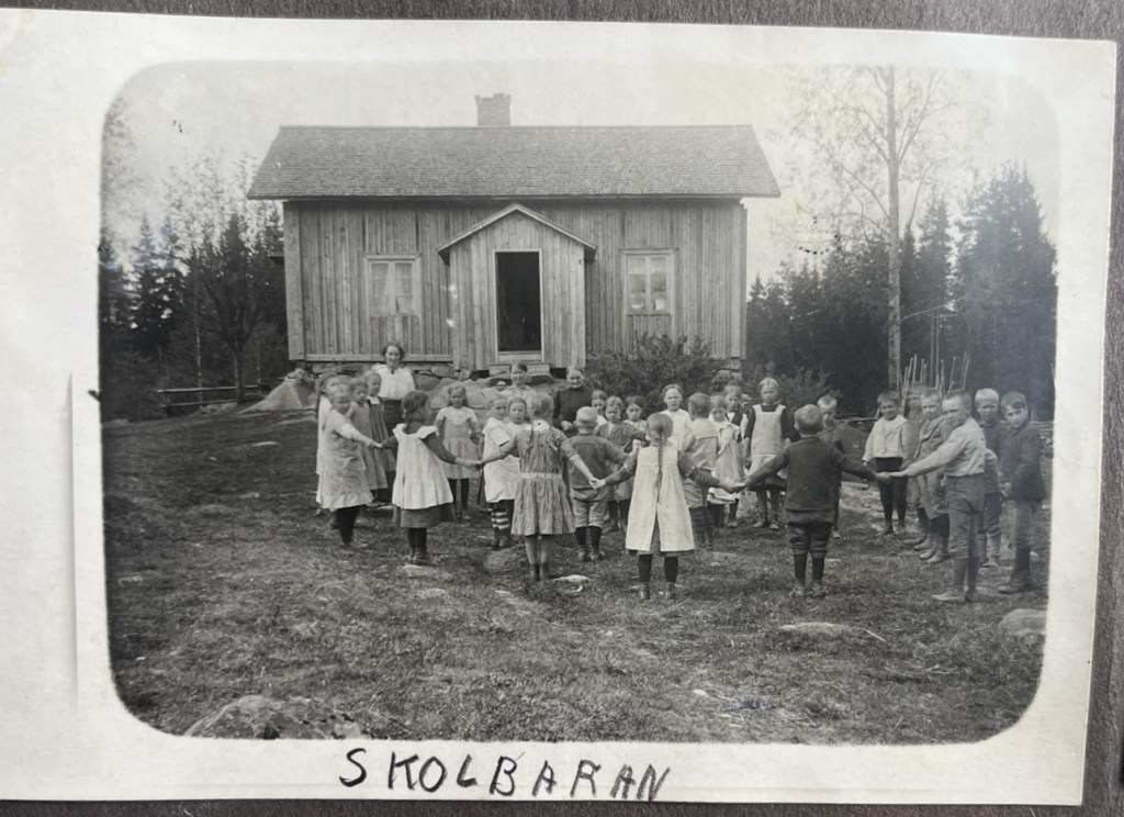 Jag vet inte vad det är för skola ovan. Den ser väldigt liten ut, mer som en vanlig stuga. Det var vanligt att de hade långt till skolan och fick gå flera kilometer på en stig i skogen för att komma dit och hem.