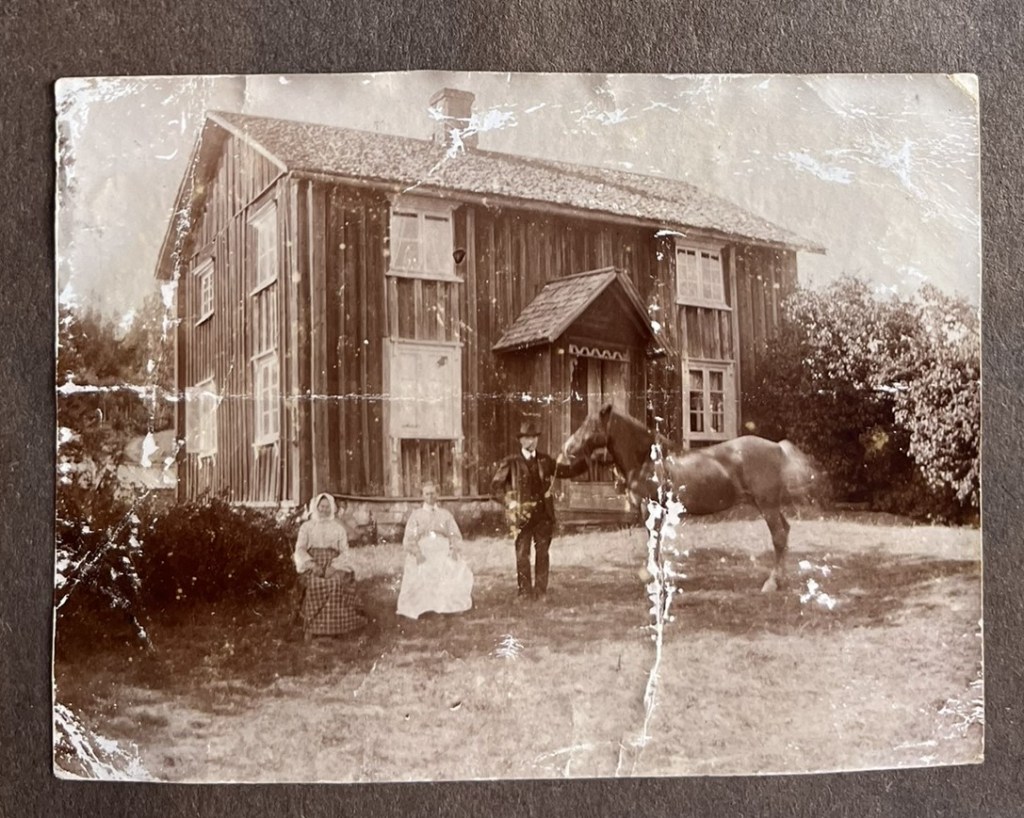 Man kan tänka sig att hästarna var viktiga och de är ofta med på bilderna man tar på gården och människorna som bor där. Den här bilden ser väldigt gammal ut både på utseendet och hur människorna är klädda och jag vet inte vilken stuga det är. Hästen visas stolt upp:
